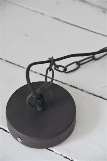 eine zauberhafte Lampe mit einem Lampenschirm aus Metall mit einem schwarzen Finish, mit einem textilem Kabel und dazugehörigem Baldachin.